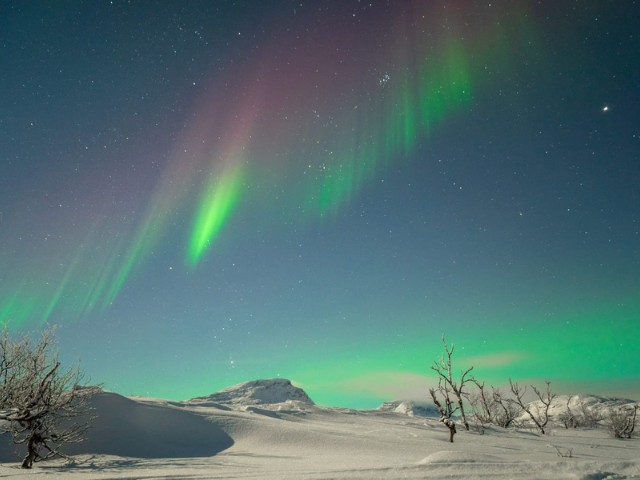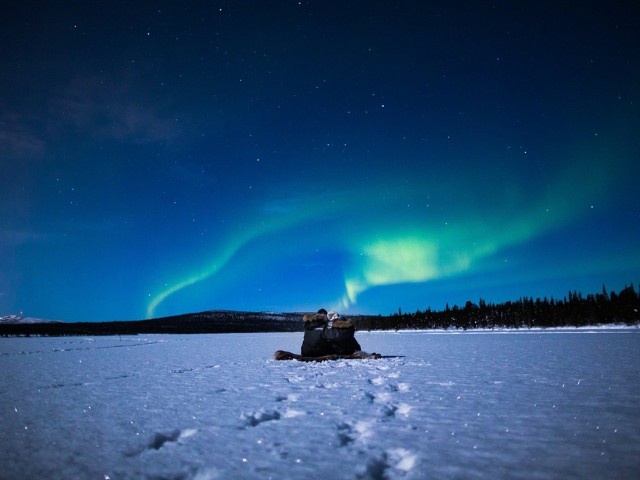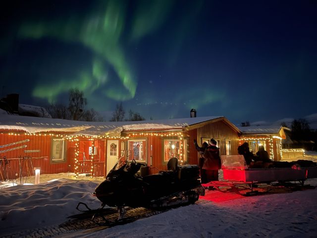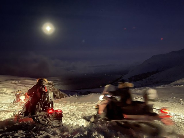 An evening of nature’s beauty – maybe a moonlight sky with the aurora’s green flames licking the sky. Seeing the Northern Lights may require a little patience and how can you best resolve the situation? We take you on an exciting snowmobile ride a bit up on the bare mountain where the conditions for a spectacle of the polar night's phenomenon occur best. We start our tours as usual with a safety and driving instructions before we head out into the cold dark night, the light of the snowmobile lights illuminates the trail as we drive. Where the guide considers it a suitable place to stay protected from the weather and wind, we park the snowmobiles. When we put out, we concentrate on what nature has to offer us. A pleasant fire can gild our moment while we have a snack and a hot drink. When we return from the tour, the night is young, and it is perfect for you to continue searching for the aurora on you own. The guide will give you good tips where you can reach good aurora viewing spots by foot from your accommodation.