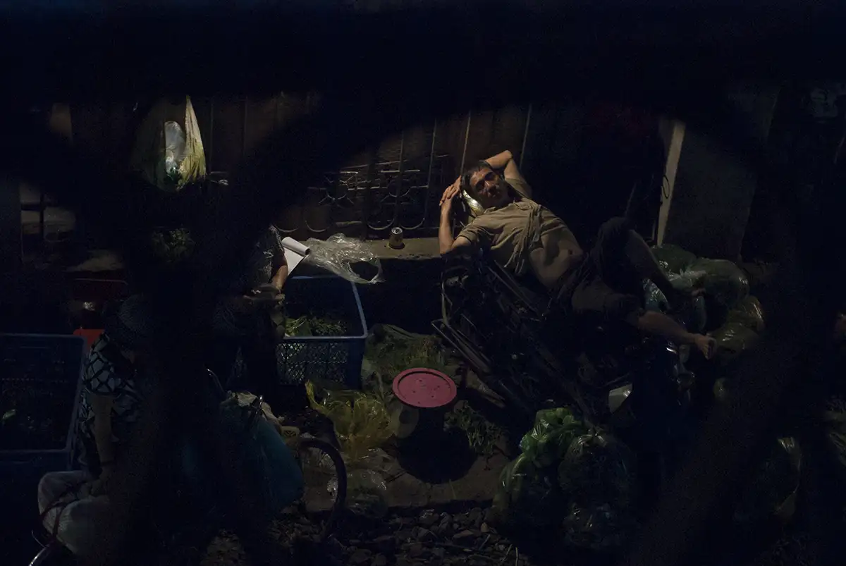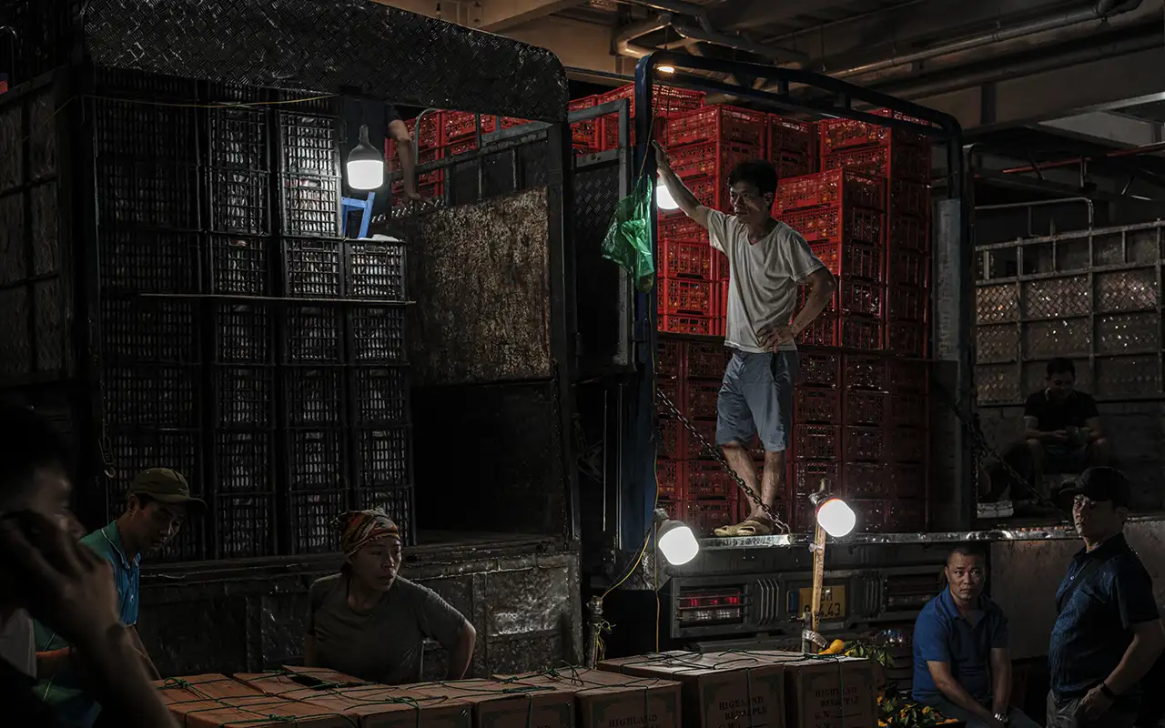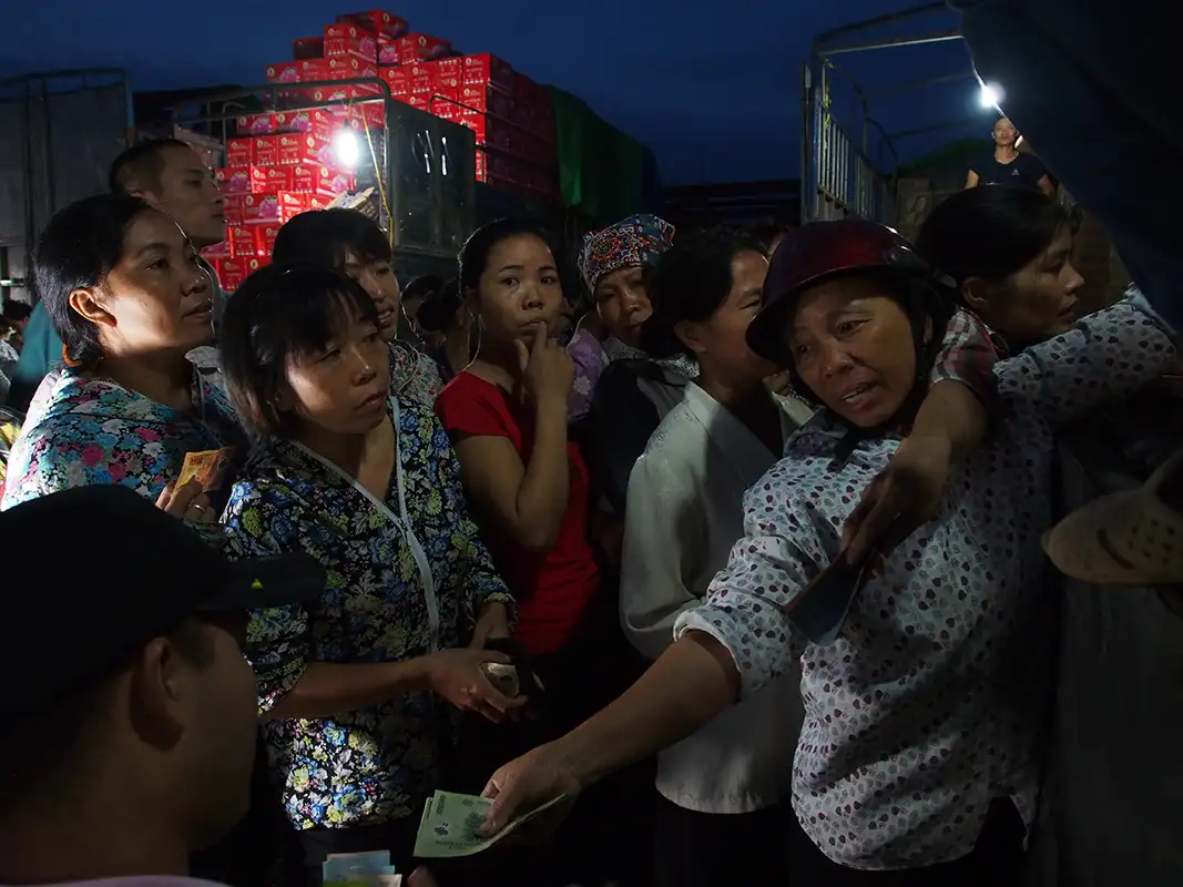 Inside Long Bien market, we'll focus on intimate relationship shots of local workers, utilizing special techniques to capture the action. Explore the fish market, working with different shutter speeds for dynamic scenes of workers sorting seafood. This is also a great spot for detail shots - of goods and traders' tools, for example. We then venture towards the back of the market for candid portraits of couriers on their trucks.