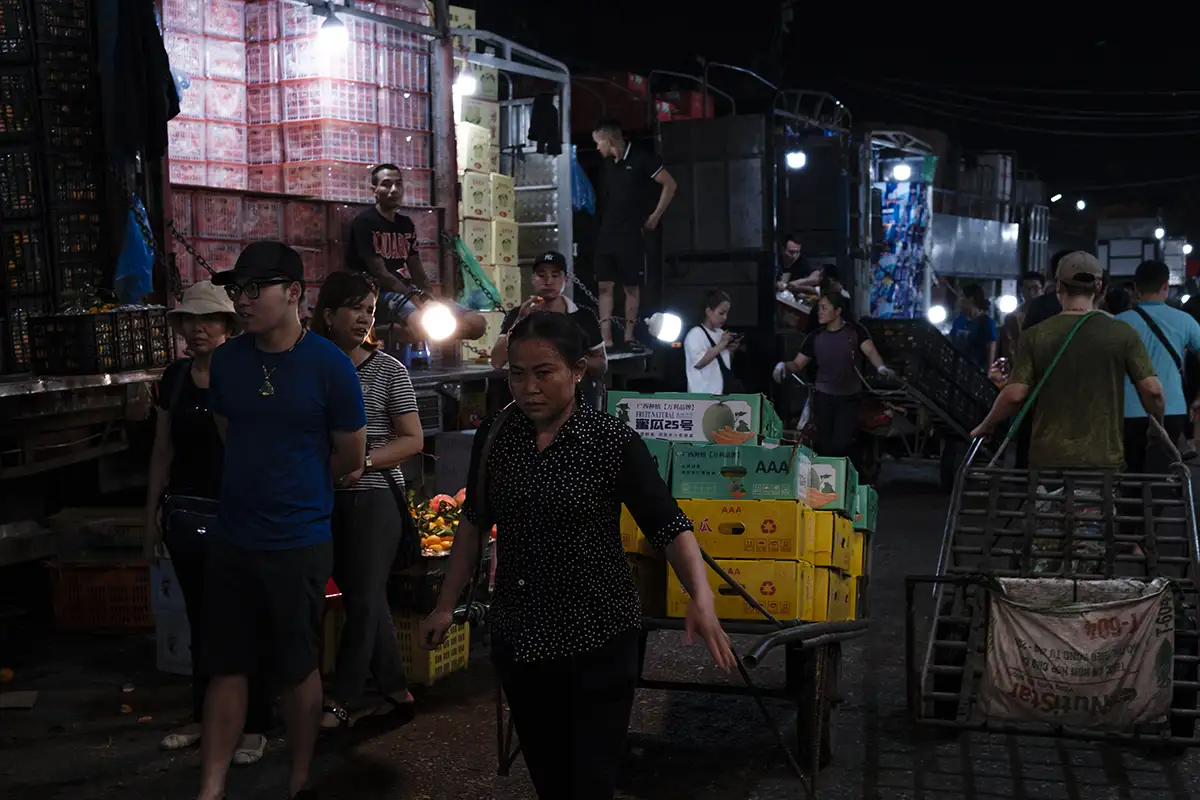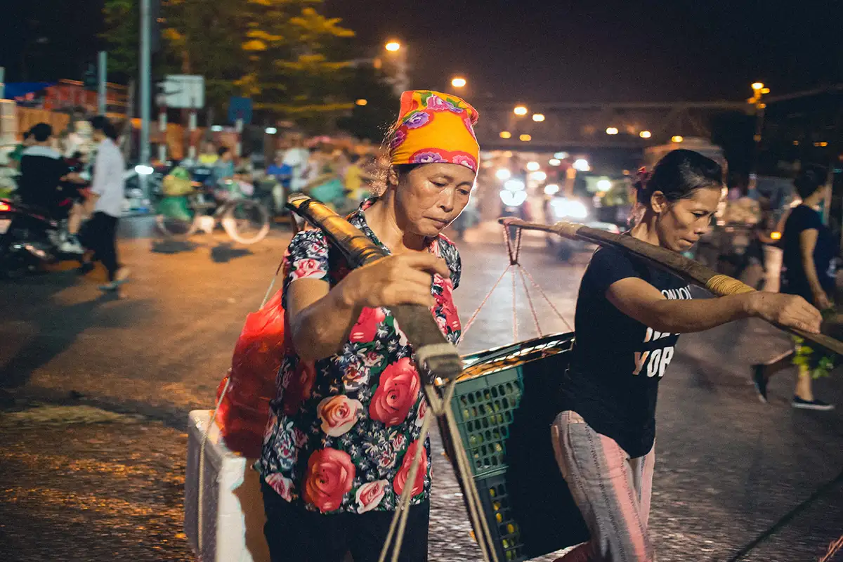 We begin with a comprehensive review of night photography settings, delving into light adjustments to enhance Old Quarter street scenes. We then look at long exposure shots, capturing the light-streams of traffic through the ancient city gate. Next, we cross the overpass to venture towards Long Bien market, weaving through lively market traders and locals carrying produce. Beneath the bridge, stalls provide unique perspectives, while the main entrance offers opportunities for panning shots of loaded bikes and couriers.